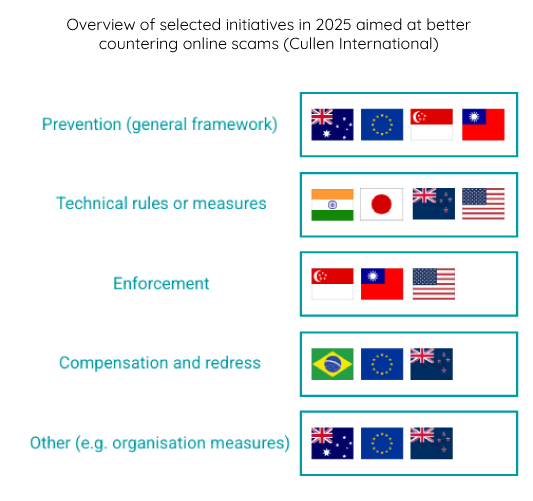 - In 2025 some jurisdictions around the world adopted or proposed new legislation and policies related to scams. The focus of those initiatives regards various aspects, ranging from enforcement aspects to mechanisms to compensate scam victims.