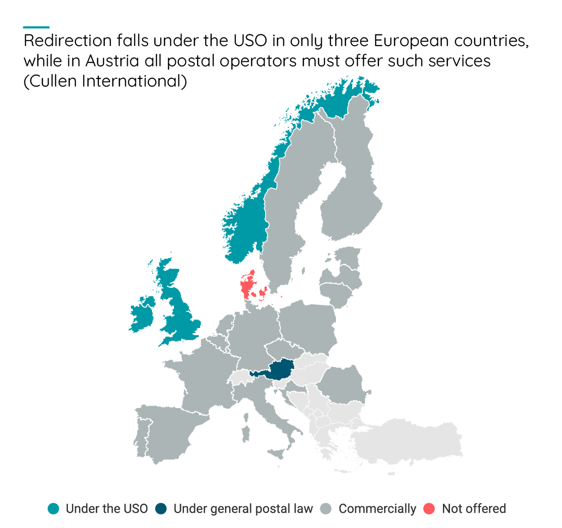 Redirection services are imposed on the USP as part of the universal service obligation in Ireland, Norway and the United Kingdom. Austria is the only researched country in which all postal service providers must provide the option to forward mail items.